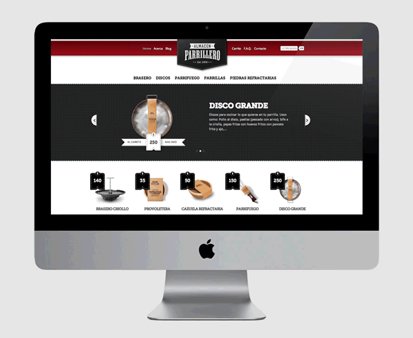 Almacén Parrillero has a simple concept: Everything for the barbacue man. They came to us in search of an identity, so we did. But also we developed a packaging system based on stamps, very cheap but not less beautiful and useful for identification of their products, all of them related to barbacue’s world. We also did for them their online store where people can buy all their products.
