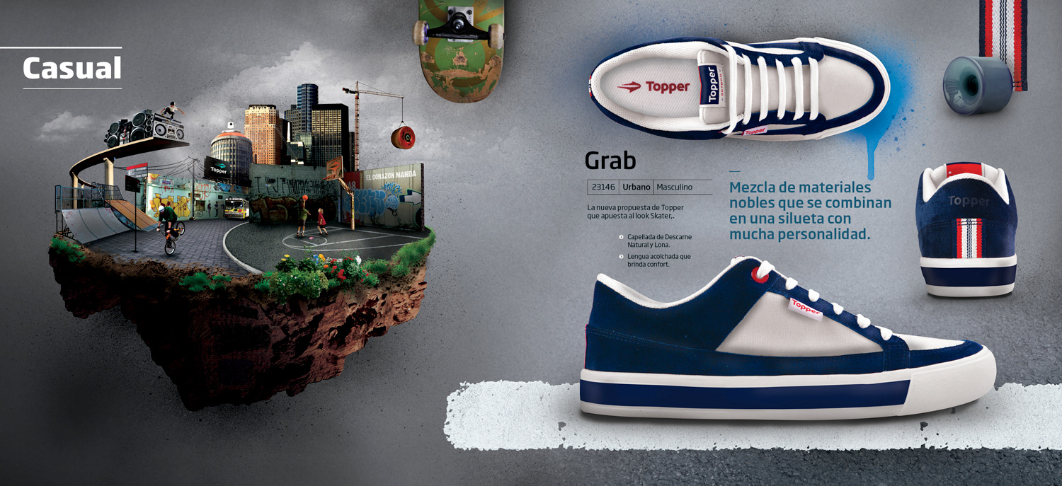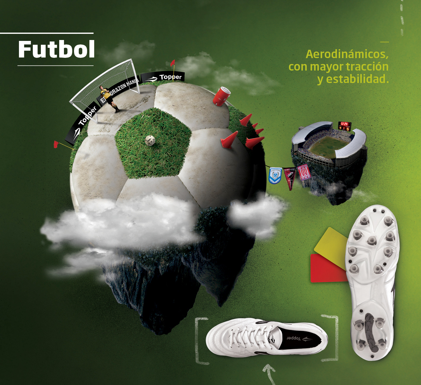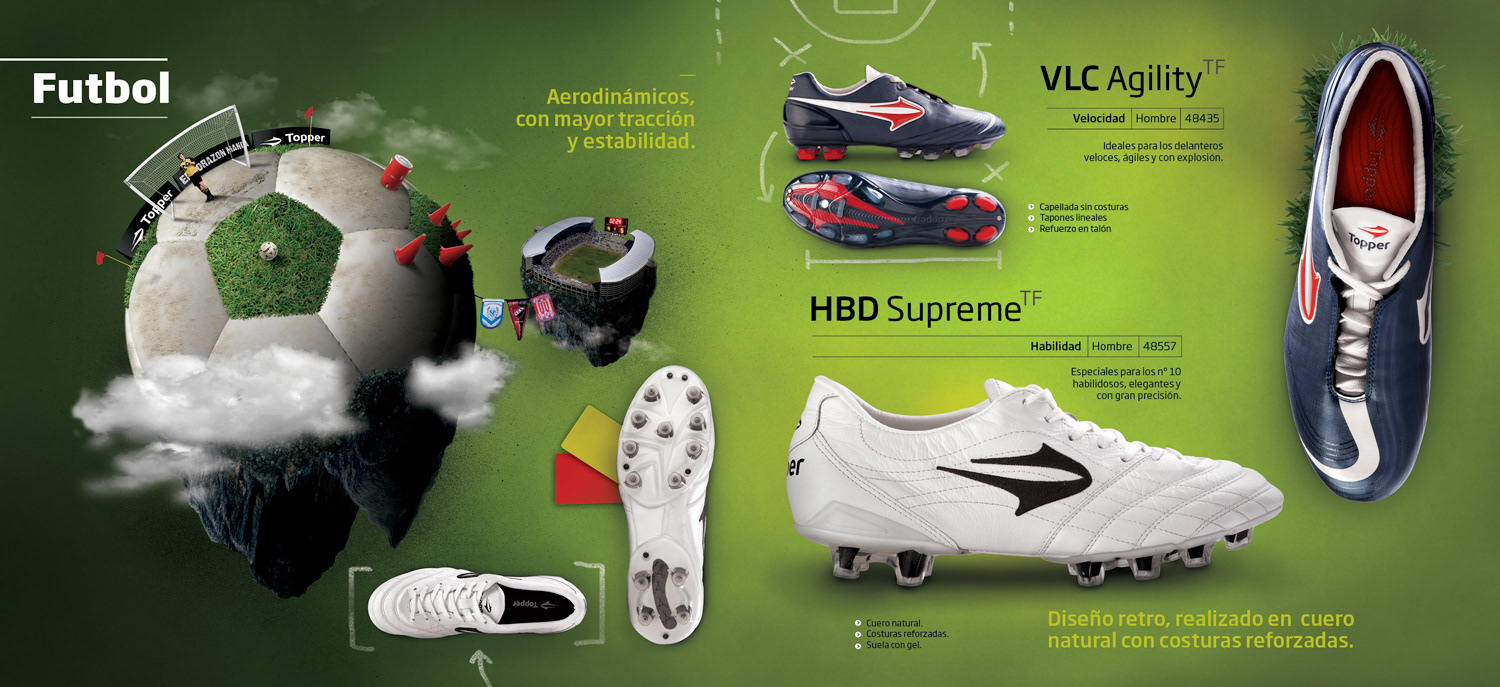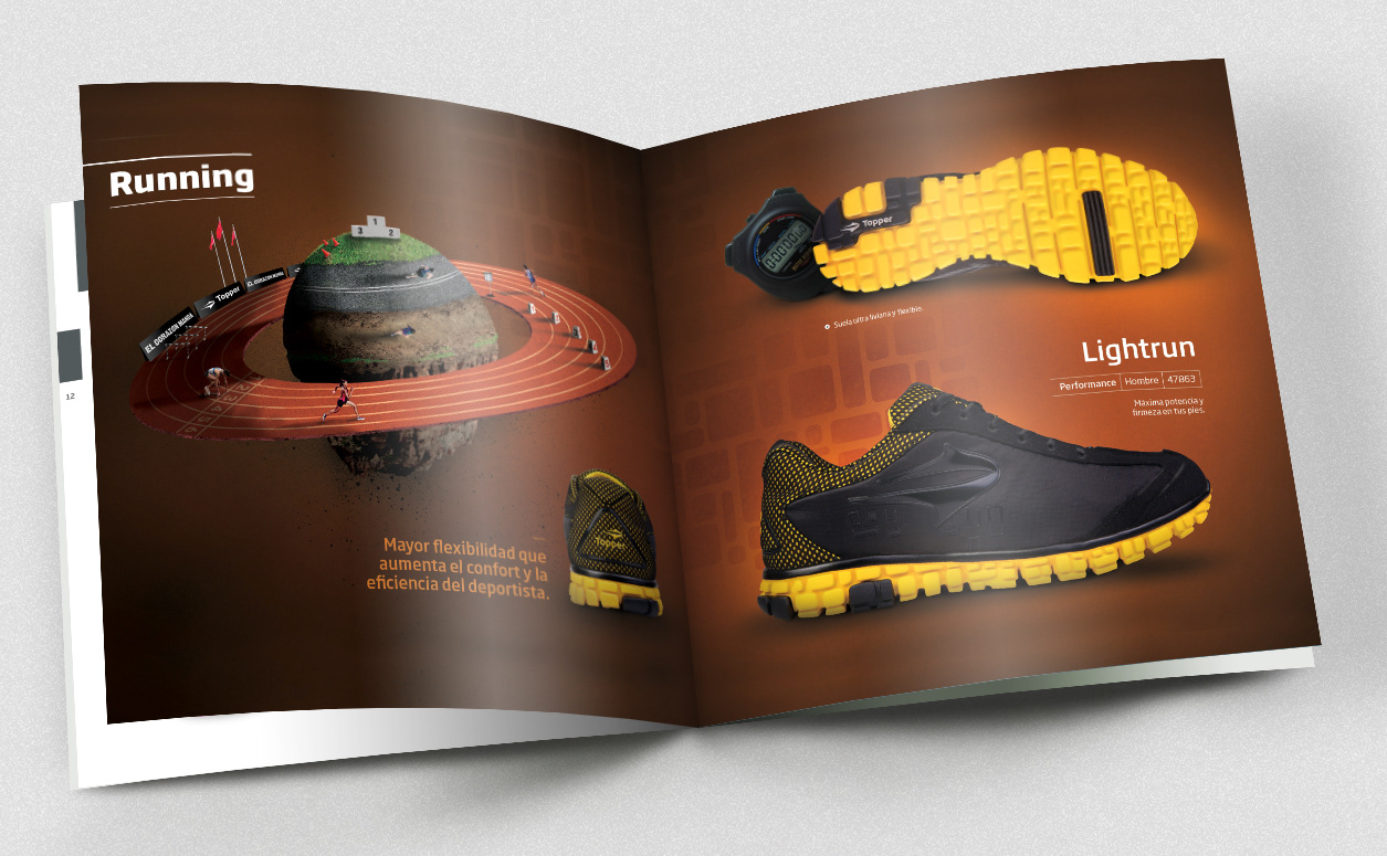 Nos encargaron diseñar el catalogo de calzado invierno de 2012 y pensamos en una línea de catalogos desde el packaging muy sencillo, en sistema con futuros años y temporadas, pero adentro cada uno diferenciado conceptualmente. En este caso nos imaginamos como sería el planeta de cada deporte, ya que cada uno es muy distinto al otro, pero forman parte de un mismo universo.