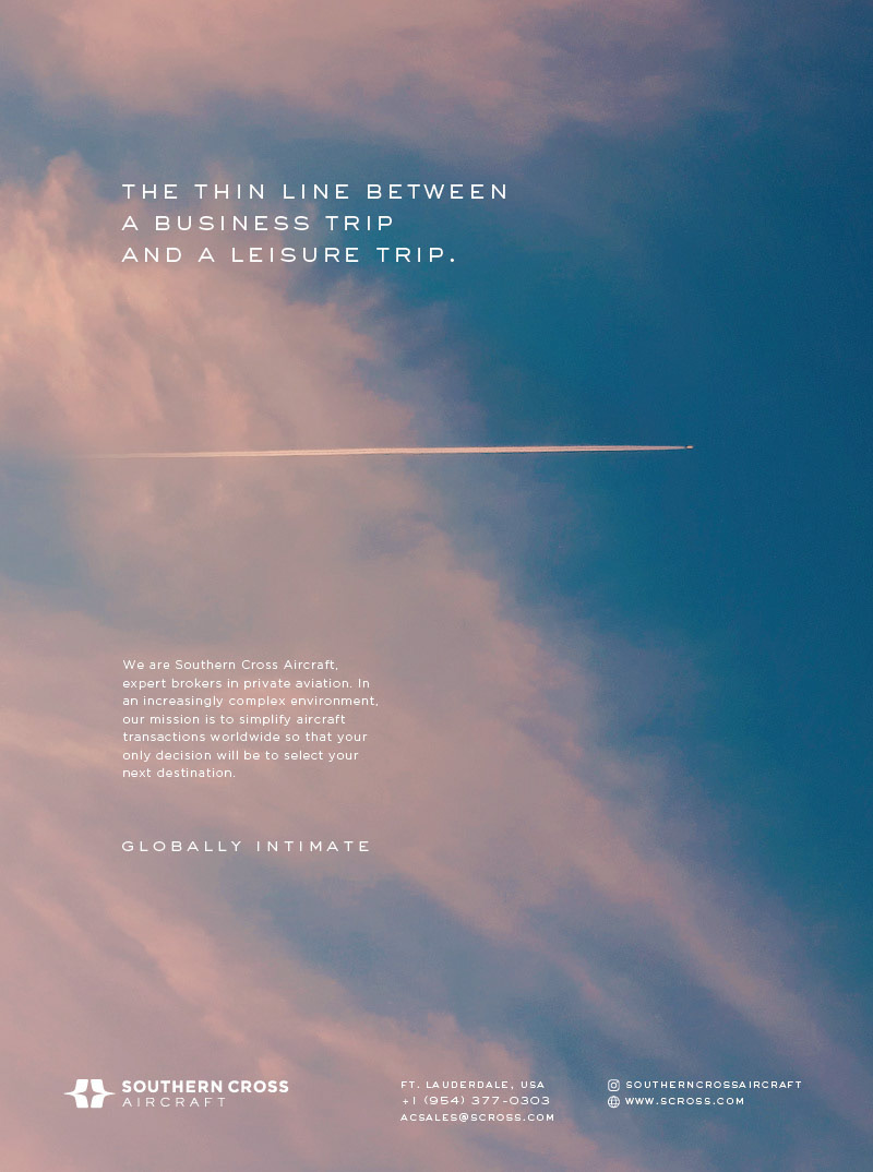 Southern Cross Aircraft are a world leading broker company specialized on Aircrafts. They have the "know how" to simplify the complex process of acquiring or selling a Jet. The company is lead by young professionals who came to 22DG looking for a branding refreshment which included the advertising campaign for offline and online top media such as The Economist among others.